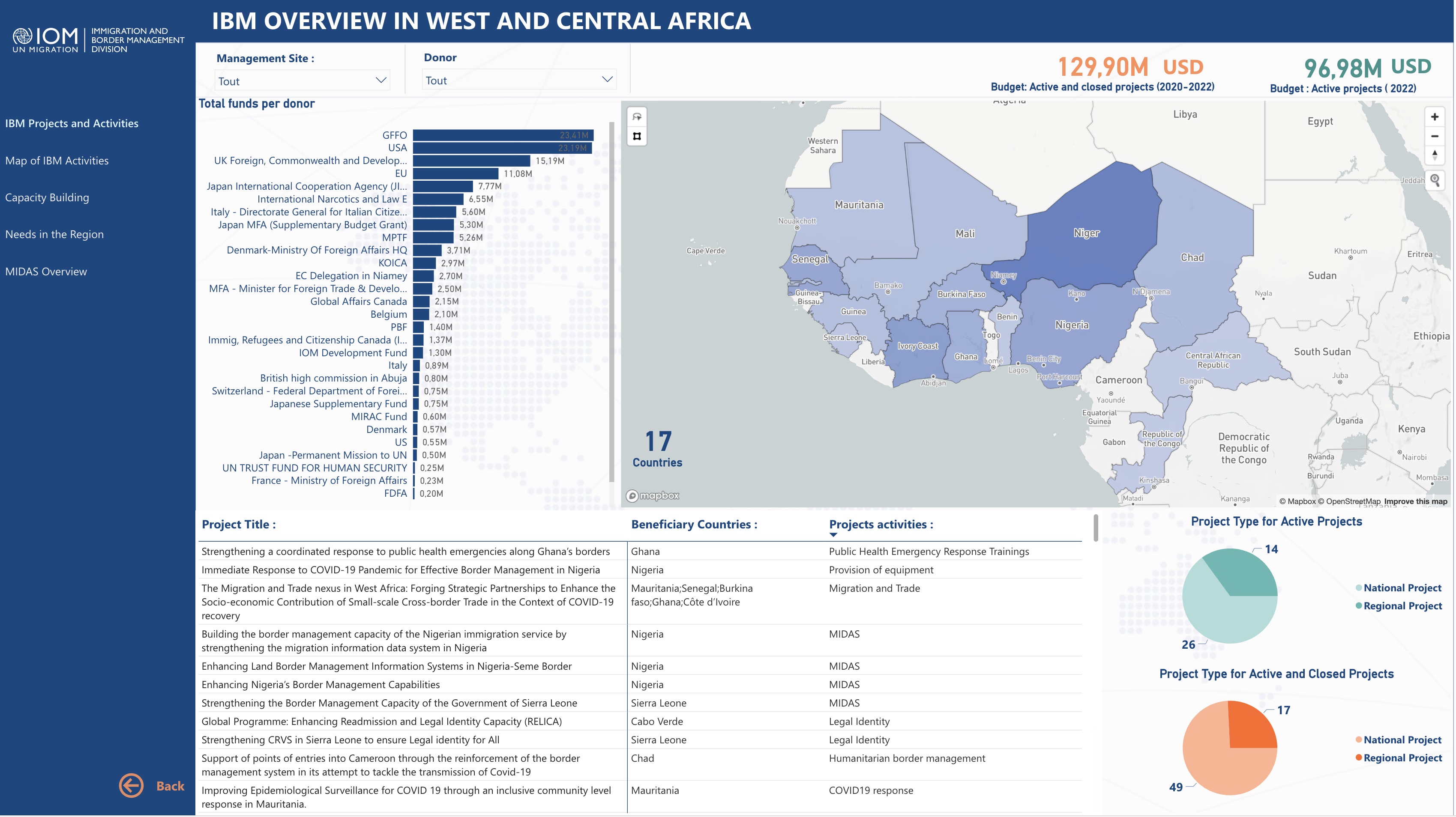 This dashboard brings together all the information gathered on IBM’s activities in the WCA region, focusing on All IBM projects and activities (between 2020 and today); IBM activities implemented in projects with IB as primary and secondary code; IBM activities implemented in projects without IB code; different activities or components of each project; specific locations of IBM projects and activities; Capacity building: Overview of main topics and number of intended beneficiaries for 1) government officials and 2) communities/CSOs, etc. (where possible disaggregated by gender); Donor and budget per project; Priorities/needs identified at national and/or regional level, their locations, etc. for future intervention. (Priorities/needs identified at national and/or regional level, their locations, etc. for future intervention).