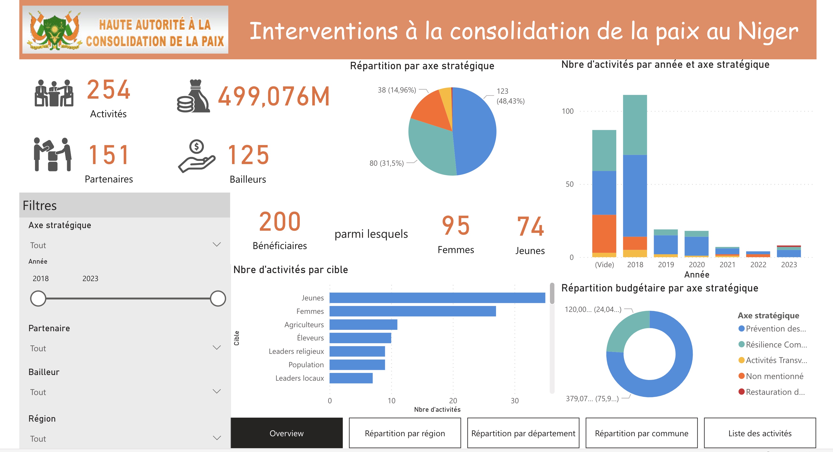Support was provided to the HACP/assigné coordination mechanism in its capacity to manage information relating to community stabilization programs in Niger, as well as to the timely analysis and sharing of information. The dashboard gives technical and financial partners a quick overview of the various peacebuilding interventions in Niger.